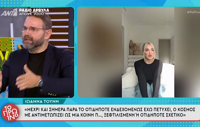 Το βίντεο που δημοσίευσε η Ιωάννα Τούνη στο Instagram για την υπόθεση του revenge porn αποτέλεσε θέμα συζήτησης στην εκπομπή «Το Πρωινό». Ο Σταύρος Μπαλάσκας εξέφρασε έντονη αντίθεση με την απόφαση της influencer να μιλήσει δημόσια μέσω των social media, λέγοντας μάλιστα να το «βουλώσει» και να αφήσει τον δικηγόρο της, Μιχάλη Δημητρακόπουλο, να κάνει τη δουλειά του. «Είναι όλη μέρα με την τουαλέτα στη Μεγάλη Βρετάνια, είναι σε τρία γιοτ. Εδώ κορίτσι μου έχεις ένα δράμα, έχεις πάθει κάτι που το έ ...