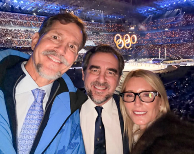 Ο Παύλος Ντε Γκρες με γαλανόλευκη γραβάτα, μαζί με τη Μαρί Σαντάλ και τον αδελφό του, Νικόλαο στην τελετή έναρξης των Ολυμπιακών